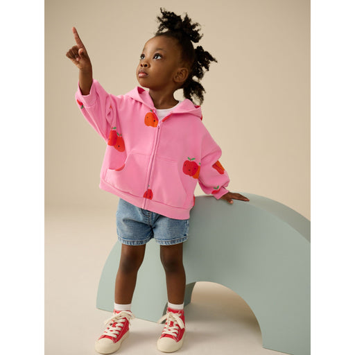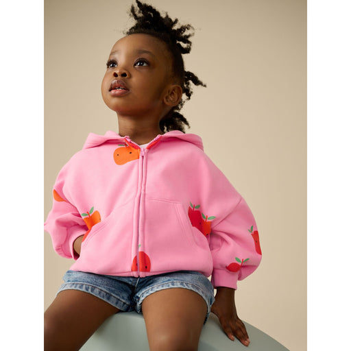 Mysig och lekfull fleecejacka i en härlig rosa färg, dekorerad med charmiga äppeltryck. Perfekt för att hålla värmen under kyliga dagar. Den har en...